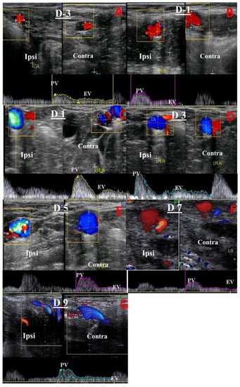 Figure 2. Hemodynamic changes on the ipsi-lateral and contra-lateral sides of the middle uterine artery (MUA) were monitored using a color pulsed-wave Doppler device on days −3 (A), and –1 (B), and 1 (C), 3 (D), 5 (E), 7 (F), and 9 (G) post-estradiol benzoate administration in puerperal buffaloes. The squared content in subfigures represents the imaging of the MUA via color Doppler ultrasonography. ipsi = ipsi-lateral, Contra = contra-lateral, PV = peak velocity point, and EV = end velocity point.