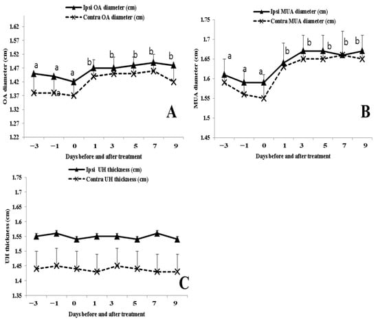 Both the OA and MUA cross-sectional diameter (cm) increased (p < 0.05) on the ipsi-lateral and contra-lateral sides within 24 h until day 9 post-treatment (Figure 3A,B), while uterine horn thickness (UHT; cm) was not affected by the EB injection over the studied time points (Figure 3C). In addition, both sides’ (ipsi-lateral and contra-lateral) values of cross-sectional diameter and UHT were positively correlated with each other (r = 0.72, p < 0.05).