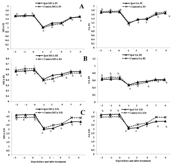 3.2. Alterations in the OA and MUA PI, RI, and S/D Ratio