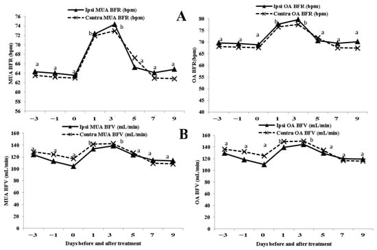 BFR and BFV within the OA and MUA increased on both sides on day 1 until day 3 post-injection of EB (p < 0.05), while their values started to decrease after day 3 and reached the pretreatment value at day 9 post-injection (Figure 5B). No significant differences in the BFR and BFV between the ipsi-lateral and contra-lateral sides of the two assessed arteries were found. Values of BFR and BFV in the two assessed arteries (OA and MUA) showed strong positive correlations between the ipsi-lateral and contra-lateral sides (r = 0.89 and p < 0.01, and r = 0.99 and p < 0.01 for OA; r = 0.84 and p < 0.01, and r = 0.86 and p < 0.01 for MUA).
