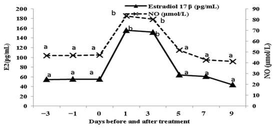 Changes in estradiol 17ß (E2; pg/mL), and nitric oxide (NO; µmol/L) concentrations in buffalos (n = 8) during the studied time points (from day −3 until day 9 after estradiol benzoate injection). Values are presented as mean ± SEM and different superscript values indicate significant differences (p < 0.05).