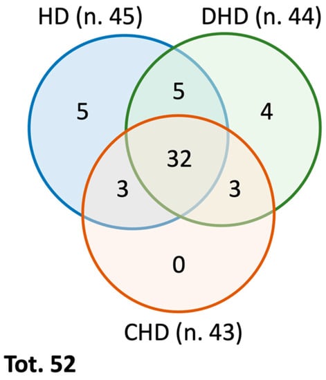 From a qualitative analysis of the proteomics data, it is possible to underline that, in total, 79 different proteins of canine origin were identified in the three study groups, in particular, 66 in the HD group, 61 in the DHD group, and 53 in the CHD group. After applying proper filters, i.e., eliminating proteins identified by a single peptide, of the proteins with a false discovery rate (FDR) confidence other than high (i.e., medium or low), and the proteins not detected in all four technical replicates performed, 52 different total proteins remained: 45 in the HD group, 44 in the DHD group, and 43 in the CHD group (Figure 1). A total of 32 same proteins were found in all three groups, while 20 were differently present within the three groups; 5 proteins were found in the HD and DHD groups but not in the CHD, 3 proteins were found in the HD and CHD groups but not in the DHD, 3 proteins were found in the DHD and CHD groups but not in the HD. Furthermore, 5 proteins were found only in the HD group, 4 proteins were found only in the DHD group, and no proteins were found only in the CHD group (Figure 1). All qualitative results are reported in Table 2.