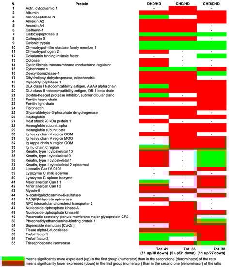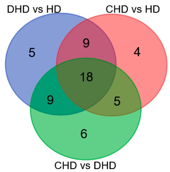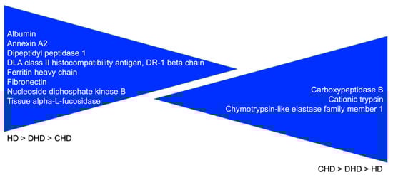Proteomic results demonstrated that there were 18 common proteins modulated in the three comparisons. There were also five proteins that were found to be dysregulated exclusively in DHD (i.e., Colipase, NAD(P)H-hydrate epimerase, cystic fibrosis transmembrane conductance regulator, Heat shock 70 kDa protein 1, and Chymotrypsinogen 2), and only four in CHD (i.e., hemoglobin subunit alpha, NPC intracellular cholesterol transporter 2, Actin, cytoplasmic 1, and lysozyme C, milk isozyme) as compared to the HD group. Interestingly, six proteins were found to have different abundances between CHD and DHD groups (i.e., Lipocalin Can f 6.0101, Ferritin light chain, cobalamin binding intrinsic factor, N-acetylgalactosamine-6-sulfatase, hemoglobin subunit alpha, and lysozyme C, spleen isozyme). Overlapping and non-overlapping dysregulated proteins are shown in Figure 3.