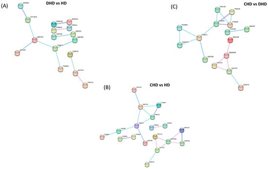 Protein network of modulated proteins in (A) DHD vs. HD, (B) CHD vs. HD, and (C) CHD vs. DHD by using STRING. The minimum required interaction score was set as the medium confidence (0.400) and the disconnected nodes in the network were hidden. Pink edges represent interactions experimentally determined, while light blue edges represent known. Proteins are indicated by their Uniprot accession number.