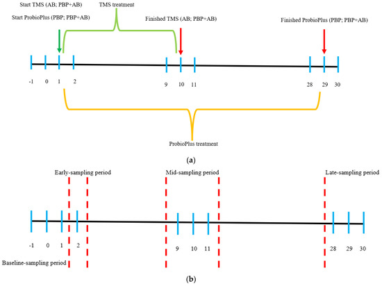 (a). Depiction of treatment durations and sampling days during each trial. Light blue lines represent fecal sampling days. Green arrow indicates the beginning of TMS and PROBIOPlus treatment. Red arrows represent the end of treatments. Green bracket represents TMS treatment period. Orange bracket represents PROBIOPlus treatment period. (b). Depiction of sampling periods and sampling days during one trial. Light blue lines represent fecal sampling days. Red dashed lines represent divisions between sampling periods.