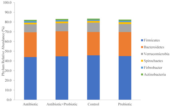 There was a significant effect of treatment on the relative abundance of Bacteroidetes (p = 0.02; Figure 2). The population of Bacteroidetes was lower in CO (24.0 ± 0.006%) compared to PBP + AB (25.7 ± 0.006%; adj. p = 0.026).