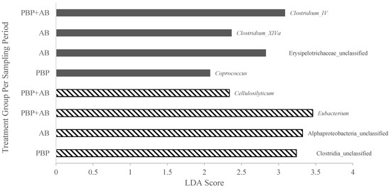 Enriched bacterial genera as assessed by LEfSe analysis with LDA scores greater than two per treatment during the mid-sampling period (corresponds to sampling days 9, 10, and 11; gray bars) and during the late sampling period (corresponds to sampling days 28, 29, and 30; dashed bars). Eight (8) horses were treated with either no antibiotic or synbiotic (CO), 10 days with oral antibiotic (AB; Trimethoprim/Sulfadiazine; 75 mg/kg BW/day), 28 days with a top dressed commercial synbiotic supplement (PBP; PROBIOPlusTM, Selected BioProducts Inc., Guelph, ON, Canada; 30 mg/kg BW/day as per the manufacturer’s instructions), or both AB for 10 days and PBP for 28 days (PBP + AB).