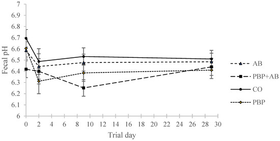 There was a significant effect of treatment (p = 0.017) and sampling period (p = 0.0008) on fecal pH. PBP + AB had a significantly lower pH (6.34 ± 0.06) compared to CO (6.55 ± 0.06, p = 0.02; Figure 4). When pH was assessed during each sampling period between treatments, it was numerically lowest in PBP + AB during the mid-sampling period (6.25 ± 0.07). However, the difference in pH did not reach statistical significance between the treatments during this sampling period, and fecal pH remained within reference intervals reported for healthy horses throughout the study [19]. No differences were noted in fecal DM. All fecal samples during the experiment were within the normal range between a score of 2 and 3.