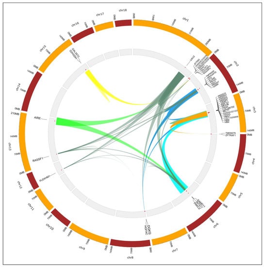 - Yu, Y.; Ouyang, Y.; Yao, W. ShinyCircos: An R/Shiny Application for Interactive Creation of Circos Plot. Bioinformatics 2018, 34, 1229–1231. [Google Scholar] [CrossRef]
