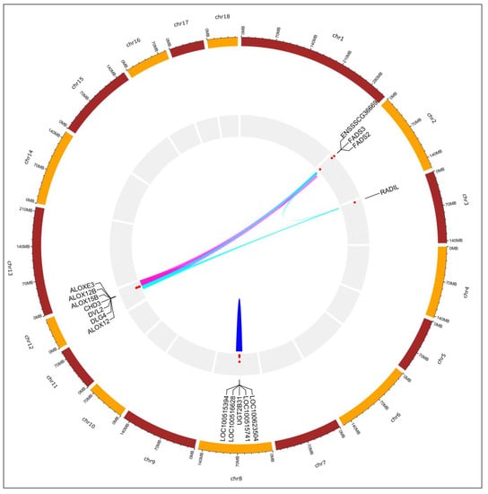 Functional annotation conducted on genes located on segregating CNVRs allowed us to identify 15 different functional annotation clusters (ACns) (Table S7), 5 of them being significantly enriched (enrichment score higher than 1.3). The 5 functional annotation clusters (ACns) included 29 genes (Figure 2): ACn1 (enrichment score = 3.35) consisted of four ALOX-lipoxygenase family genes located on SSC12 involved in metabolism and nutrient sensing; ACn2 (enrichment score = 2.70) included five different genes spanning a chromosomal area of 239.1 kb (from position 66,191,841 to position 66,430,905) on SSC8 and involved in the metabolism and digestion of bile acids and steroid hormones and liver enzymes; ACn3 (enrichment score = 2.11) included three ALOX-lipoxygenase genes, forming part of ACn1 as well, spanning a chromosomal area of 59.94 kb (from position 53,271,583 to position 53,331,523) on SSC12; ACn4 (enrichment score = 1.75) included three genes involved in the synthesis of unsaturated fatty acids and the chromatin remodeling complex. Finally, ACn5 (enrichment score = 1.57) included four genes involved in ATP-related pathways.