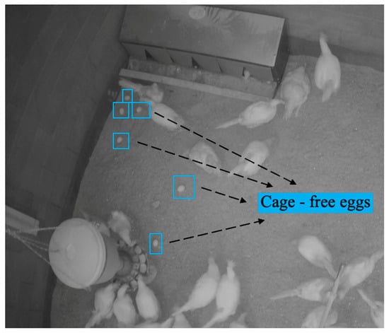 In this study, 800 Hy-line W-36 hens were used to produce cage-free eggs with free access to fresh water and feeds (Figure 1). The eggs were collected daily and stored at a temperature around 24 °C for the next sorting process, and were then graded according to size and quality. A binary classification (standard and defect eggs) was first introduced to classify the eggs manually. The standard eggs were those that were clean, and sizes ranged from small (50–55 g) to jumbo (70 g and above), while the non-standard eggs were those that were bloody, cracked, had an unusual egg shape (too long, too round or distorted), and a size less than small or more than jumbo (Figure 2) [9,19]. This classification was applied to determine the quality of the eggs and to ensure that only the best quality eggs were utilized for measuring egg weight.