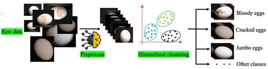 Once the egg image data have been collected, they undergo two key processing steps: preprocessing the diffraction patterns and performing hierarchical clustering on the data. These steps involve refining the diffraction patterns and organizing the data into clusters based on their similarities [20]. Preprocessing involves removing background noise, normalizing the signal intensity, and correcting for any artifacts in the data. This step ensures that the diffraction patterns are clean and reliable for analysis. Hierarchical clustering is a method for grouping similar data points into clusters based on their similarity [21]. The algorithm starts by considering each data point as its own cluster, and then iteratively merges clusters until a desired number of clusters is reached or a stopping criterion is met (Figure 4). This approach can be used to identify patterns in the egg data, such as different eggshell types (bloody, cracked and distorted) or quality grades (small size to jumbo size).