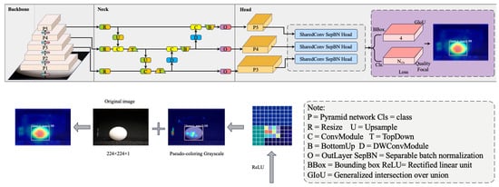 In deep learning, soft labels refer to the use of continuous, rather than binary, values as target outputs. The purpose of using soft labels is to provide the model with additional information and to encourage smoothness in the model predictions [19,23]. By employing soft labels, the model can generate predictions that provide more subtlety and precision in the classification task. Instead of solely assigning eggs to specific classes with binary labels, the soft labels enable the model to express varying degrees of confidence or probabilities for each class. This allows for a more detailed understanding of the eggs’ characteristics and their association with different classes. In addition, the use of soft labels can result in more robust models because the model is able to discover correlations between the input data and the desired outputs, even if the relationship is not obvious. In our study, soft labels are applied in problems with multi-class classification or multi-label classification (i.e., unclean eggs, standard eggs, and no standard eggs), where the model must predict the presence of multiple target classes [24,25]. In addition, on the basis of simplified optimal transport assignment (SimOTA), an advanced cost function calculation for soft labels was presented to reduce training loss, and its loss function is described below.