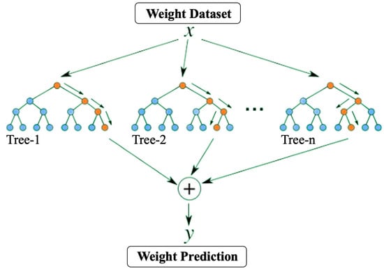 Predicting egg weight through computer vision leads to several challenges that must be addressed. One of the challenges is the accuracy of measurements of the egg’s dimensions, such as the major and minor axis. This is due to the difficulty of obtaining high-quality images or accurately identifying and measuring the egg in the image. Another obstacle is the diversity in the shapes and sizes of eggs (small–jumbo), which requires the implementation of complex machine learning algorithms that can account for various factors, including eggshell color, shape, size, and birth date, that may affect egg weight. Random Forest Regression is utilized for egg-weight prediction due to its ability to handle complex, non-linear relationships between features and target variables using an ensemble learning method that combines predictions from multiple decision trees, which are trained on randomly selected subsets of the data. This combination reduces variance and enhances the overall accuracy of the model. Furthermore, Random Forest can handle missing or incomplete data and perform effectively when there is a combination of continuous and categorical variables [18,26]. Lastly, feature importance scores are provided by Random Forest, which helps determine the most significant factors that contribute to egg weight prediction. The structure of RF is shown below (Figure 6) [27].