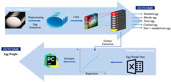 Previous works in this area primarily focused on using computer vision techniques such as convolutional neural networks (CNNs) and image classification algorithms for egg classification [11,12]. These methods have shown promising results in classifying eggs based on their size, shape, and color. However, few studies have combined deep learning and machine learning regression techniques for joint egg classification and weighting, especially including floor eggs collected from cage-free poultry farms, which is an important category for real-world egg types, which range from floor eggs to commercial eggs. This can be useful for producers who want to ensure consistent quality across all types of eggs and consumers who want to purchase high-quality eggs. Another reason for this is that the egg industry is shifting from cage to cage-free [13,14,15,16]. Therefore, introducing floor eggs is beneficial for application in the cage-free egg industry.