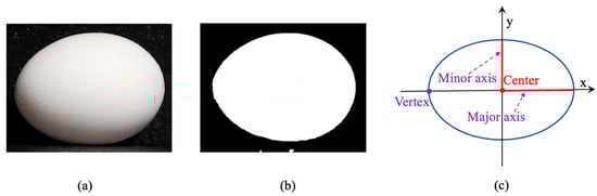 The processes of calculating egg parameters: (a) original image; (b) binary image; (c) geometric image.