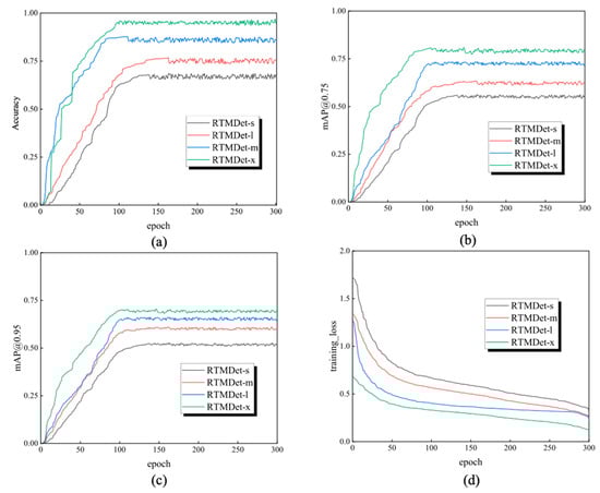 Model comparison: (a) accuracy, (b) mAP@0.75, (c) mAP@0.95 and (d) training loss.