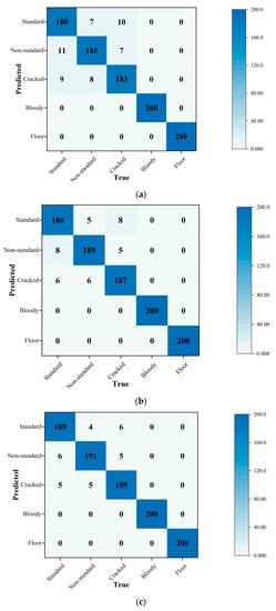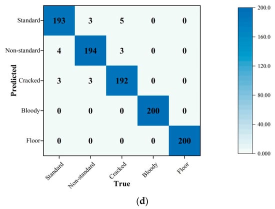 To compare the classification performances of multiple deep learning models on the classification of eggs, the confusion matrix was adopted (Figure 10). Each type of egg was tested by different models 200 times.