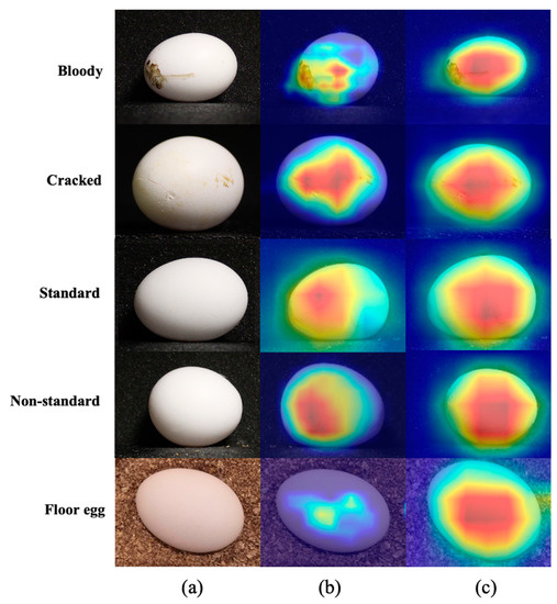 The prediction results are shown in the confusion matrix, where the gradually changing shade of blue represents the accuracy of true predictions (cells filled with deeper blue have more accurate predictions). The number in each cell represents the results of the models [33]. The average true scores (along the diagonal line from the top-left corner of the matrix to the bottom-right corner) of RTMDet-x are the highest among the whole confusion matrix of classifiers, which indicates that RTMDet-x has a better true prediction rate. The scores off the diagonal (false scores) represent the instances where the predicted class does not match the true class. The average false scores of RTMDet-s are higher than those of other classifiers, which means its performance could be improved. In terms of type error, no type error was observed in the classes of bloody eggs and floor eggs. The reason for this is their significant characters; for example, bloody eggs have clear bloody spots and only floor eggs have a litter background. However, when classifiers detect eggsusing standard, non-standard, and cracked eggs, some errors exist due to the similarities within the minor axis and major axis, and the difficulties in detecting microcracks and cracks located on the bottom or sides not shown by the camera [34]. However, the results were still acceptable because there are not many non-standard eggs or cracked eggs on commercial poultry farms (varying between 1 and 5% of the total) [35]. In general, the RTMDet-x classifier is the best experimental classifier with the highest accuracy. In addition, to visualize how RTMDet-x classifies eggs and extracts feature maps, heatmap and gradient-weighted class-activation mappings were outputted (Figure 11). To understand the model’s decision-making process and identify important regions in the input images, the gradient-weighted class activation mapping (Grad-CAM) technique was utilized [36]. Grad-CAM produces a heatmap that highlights the regions contributing significantly to the model’s predictions. By extracting the feature map from the last convolutional layer of the input egg image, a Grad-CAM heatmap is created. The feature map channels are then weighted using a class gradient computed with respect to the feature map. This weighting process emphasizes regions that strongly influence the model’s predictions. Experimental findings demonstrate the CNN-based model’s ability to effectively extract features from areas with blood spots and broken parts, even when the defects are minor. This showcases the model’s capacity to accurately identify egg abnormalities and make precise predictions.