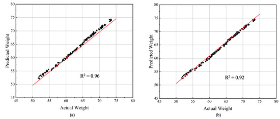 In this study, a random forest (RF) regressor was used to predict standard eggs (from small to jumbo size) because only standard eggs (consistent size and weight) can be sold to consumers by commercial poultry farms. As shown in Figure 12a, the predicted weight, using minor and major axis features using the RF regressor, showed an R2 value of 0.96, which suggests that the predicted weights were highly correlated with the actual weights of the eggs. To further analyze the best performance of RF regressor, we classified standard eggs into five types (small, medium, large, extra-large and jumbo) and test each type 100 times using an RF regressor. In addition, the storage of eggs is another important factor affecting egg weight; therefore, we also include this when comparing the predicted weight using minor and major axes obtained using the random forest regressor and the actual weight of the eggs on different storage days (R2 = 0.92) (Figure 12b). By comparing the predicted weight obtained using the random forest regressor with the actual weight of the eggs under different storage conditions, the study was able to evaluate the robustness of the regressor in accounting for storage effects. Our storage conditions (24 °C) had a minimal impact on egg diameter, which remains highly correlated with egg weight [37]. As a result, the RF regressor can continue to accurately predict egg weight. The stable storage temperature ensures that the regressor’s accuracy in estimating egg weight remains unaffected. The results suggest that the regressor is able to accurately predict egg weight under different storage conditions, which can be useful for optimizing egg production and storage practices [38].