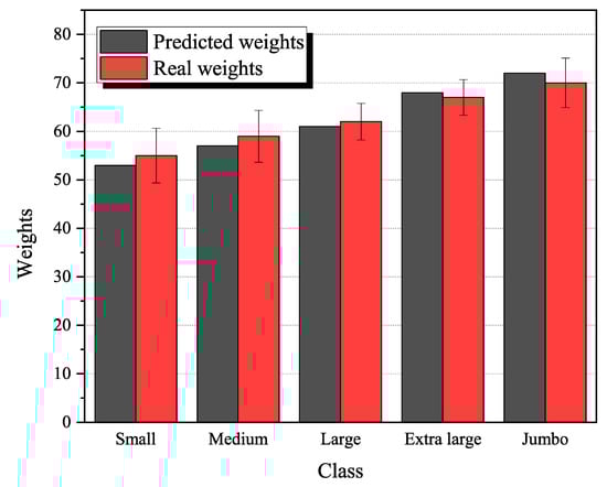 To further test the model under egg scales ranging from small to jumbo, each category randomly selected 100 pictures to test the robustness and precision of the regressor. The results are shown in Figure 13. The error bar at the top of each stacked bar graph represents the standard error of each class and the height of the green bar represents the absolute error between real weights and predicted weights. From the graph, we can find the height of the error bar for small, medium and jumbo eggs is lower than that for large and extra-large eggs, which indicates that the regressor has a better prediction performance for large and extra-large eggs. This may because the large and extra-large eggs have medium values according to the regression model; in a large dataset, the relationship between the precited variables and the response variables is more complex, resulting in the risk of overfitting and more prohibitive computational costs. However, the data in the medium values may be less affected by measurement error or other types of noise than very small or very large values [39,40]. This can help to improve the accuracy of the regressor predictions. In addition, for some types of data, preprocessing can be simplified for medium values. For example, scaling or normalization may not be as critical for medium values as it is for very small or very large values. In addition, medium values may be complex enough to require a more sophisticated model, but not so complex that the model becomes difficult to interpret. This can help strike a balance between model performance and interpretability.