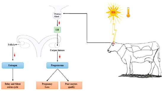 The reproductive capacity of cows declines due to the detrimental effect of HS on the process of oogenesis. When cattle are exposed to HS, abnormal hormones are released from the hypothalamus, leading to poor follicles and low-quality oocytes. These low-quality oocytes compromise fertility and reproduction [].