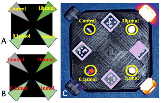 Schematic representation of the phantoms containing the micromolar (A) and nanomolar (B) dilutions of the fluorophores. (C) Phantom containing the micromolar dilutions of ICG, imaged with Visionsense under room light conditions. The areas where the dilutions were imaged are marked with yellow circles and the corresponding dilution.