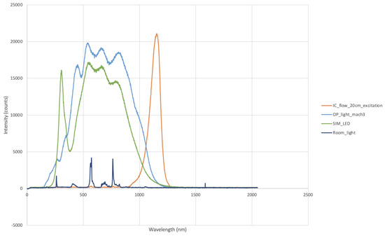 The emission spectra of each surgical light were measured to assess the interference with the NIR spectrum (Figure 2). When the phantoms were imaged with VisionsenseTM VS3 Iridum, a working distance of 30 cm between the camera and the phantom was maintained as per the manufacturer’s recommendations; the shutter was set at 1961 and 176; and the gains were set at 2427 and 100. For the IC-FlowTM, a standard working distance of 20 cm was chosen, which was in line with the manufacturer’s recommendations. The light and intensity were set at 100%.