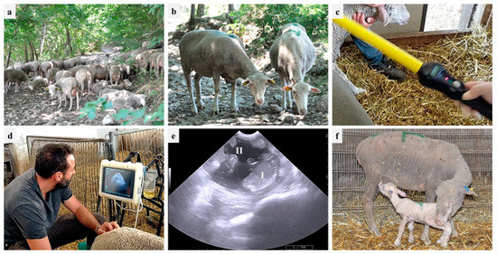 On-farm reproductive monitoring in one Gentile di Puglia (GdP) flock: (a) flock in the pasture; (b) two GdP ewes; (c) ruminal bolus reading; (d) transabdominal ultrasound; (e) pregnancy diagnosis based on fetus (I) and cotyledon (II) identification; (f) suckling GdP lamb.