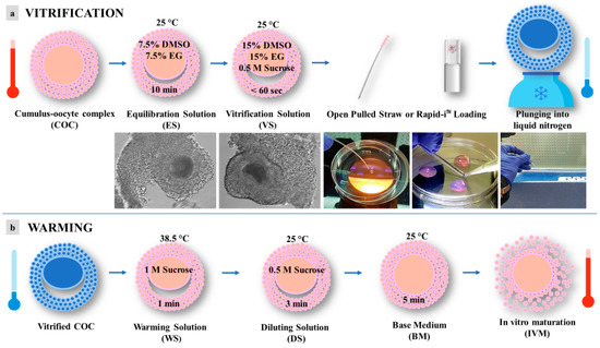 Schematic representation of vitrification protocol for pre-pubertal lambs’ immature cumulus-oocyte complexes (COCs): (a) vitrification; (b) warming. DMSO = dimethyl sulfoxide; EG = ethylene glycol.