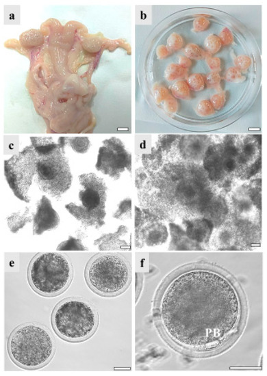 GdP female reproductive system specimens: (a) female reproductive tract with the two uterine horns, oviducts, and ovaries. Scale bar represents 1 cm; (b) ovaries isolated for cumulus–oocyte complex (COC) retrieval. Scale bar represents 1 cm; (c) COCs with compact or (d) expanded cumuli observed under inverted-phase contrast microscopy before and after 22–24 h IVM. Scale bars represent 40 μm; (e) denuded oocytes. Scale bar represents 40 μm. (f) Matured oocyte with the first polar body (PB) extruded. Scale bar represents 40 μm.