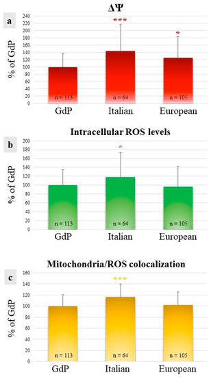 Quantification data of (a) mitochondrial membrane potential (ΔΨ), (b) intracellular reactive oxygen species (ROS) levels, and (c) mitochondria/ROS colocalization in GdP MII oocytes compared with Italian and European ones. Values are presented as percentages of the signal of GdP samples. Means ± SD of fluorescence intensity of the MitoTracker Orange CMTM Ros, DCF, and overlap coefficient are presented. The numbers of analyzed oocytes per sheep population are indicated at the bottom of each bar. One-way analysis of variance (ANOVA) followed by Tukey’s multiple comparison test: * p < 0.05; *** p < 0.001.