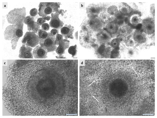 GdP COCs after vitrification/warming as observed (a,c) before and (b,d) after IVM, (a,b) in groups or (c,d) individually. It can be seen that, before IVM, the majority of GdPs’ vitrified/warmed COCs show complete compact and multilayered cumulus. After IVM, the majority of GdP vitrified/warmed COCs show regular cumulus expansion, with individually visible cumulus cells and their cytoplasmic protrusions. Scale bars represent 40 µm. The arrows indicate the intact cytoplasmic protusions of cumulus cells, after COC vitrification/warming and IVM.
