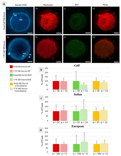 Effects of immature COC vitrification on bioenergetic/oxidative parameters in GdP MII oocytes: (a) Photomicrographs showing representative images of one fresh (lane 1) and one vitrified/warmed (V/W) (lane 2) GdP oocyte. Corresponding epifluorescence images showing nuclear chromatin configuration (column a: Hoechst 33258) and confocal images showing the mitochondrial distribution pattern and activity (column b: MitoTracker Orange), intracellular ROS localization and levels (column c: H2DCF-DA), and mitochondria/ROS colocalization (column d: Merge). Confocal images were taken at the oocyte equatorial plane. Scale bars represent 40 µm. (b–d) Quantification data of mitochondrial activity (ΔΨ), intracellular reactive oxygen species (ROS) levels, and mitochondria/ROS colocalization in GdP MII oocytes, obtained after IVM of fresh and V/W COCs, compared with Italian and European ones. Within each sheep population, values of V/W oocytes are presented as a percentage of the signal of fresh samples. Means ± SD of fluorescence intensity of MitoTracker Orange CMTM Ros, DCF, and overlap coefficient are presented, respectively. The numbers of analyzed oocytes per sheep population are indicated at the bottom of each bar. Unpaired Student’s t-test: not significant.