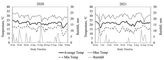 Daily average, minimum, and maximum temperatures (°C) and precipitation (mm) throughout the study period at Southwest Agriculture Research and Extension Center, Glade Spring, VA, USA.