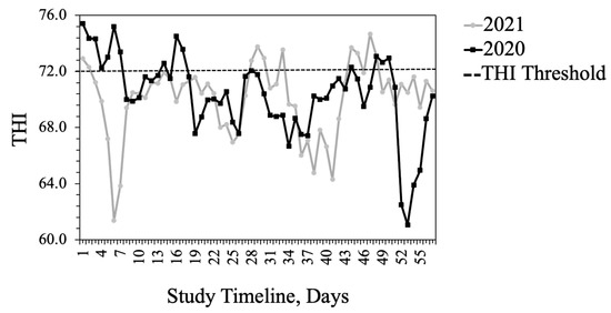 Daily average temperature-humidity index (THI) throughout the study period at Southwest Agriculture Research and Extension Center, Glade Spring, VA, USA.
