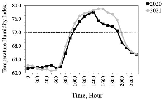 Average temperature-humidity index (THI) by hours during the intravaginal temperature and heifers’ behavior data collection dates for 2020 and 2021 at Southwest Agriculture Research and Extension Center, Glade Spring, VA, USA.