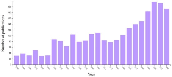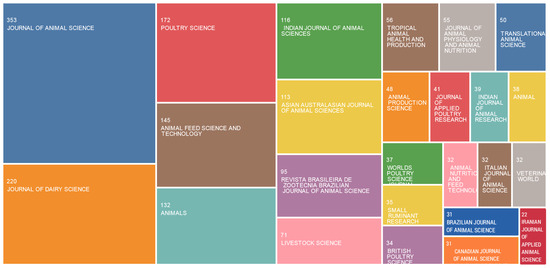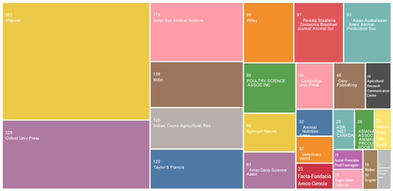 The top 25 publishers to have published articles on topics related to CTM are presented in Figure 3. A total of 135 publisher records were identified between 1951 and 2022. The greatest number of articles published on CTM was in Elsevier, accounting for 19.7% of total published papers. Of the 1827 articles published by the top 10 publishers, 562 articles were published by major publishers, namely Elsevier, followed by Oxford University Press (n = 328), the American Society of Animal Science (n = 179), MDPI (n = 138), the Indian Council of Agricultural Research (n = 125), Taylor & Francis (n = 120), Wiley (n = 99), Revista Brasileira De Zootecnia—Brazilian Journal Of Animal Science (n = 97), the Asian–Australasian Association of Animal Production Societies (n = 93), and Poultry Science Association Inc. (n = 86).
