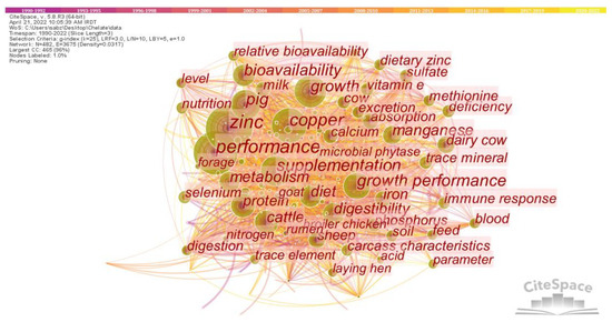 This is a descriptive study using keyword co-occurrence and reference analysis. Data were extracted from the Web of Science (WOS) expanded scientific citation index on 10 January 2023. The literature search included all research and review articles and books on CTM from 1990 to 2022 in peer-reviewed journals indexed in WOS. To obtain data, the Web of Science Core Collection was selected. Then, in the advanced search of this database, the following combinations of formulas and keywords (Topic ((chelate) OR (micro mineral) OR (trace minerals) OR (organic minerals))) were used AND (ANIMAL SCIENCE) AND (LIMIT-TO (SUBJAREA) AGRI”) are used and confined to research and review articles. Finally, to make the data readable by the software CiteSpace (v. 5.8.R3, Philadelphia, PA, USA), VOSviewer (v. 1.6.17, Leiden, The Netherlands), and HistCite (v. 12.03.17, Philadelphia, PA, USA), the data were stored on a computer in plain text format in categories of 500 records (since Clarivate Analytics limits the number of downloaded records to 500). The retrieved files were then compiled into a single comprehensive file and analyzed. To appropriately generate and evaluate thematic maps, keywords were homogenized using a thesaurus, removing similar and identical keywords, as well as plural and singular forms of integration and non-specialized keywords.