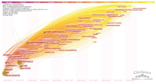 The map of keyword co-occurrence was created to reflect the scientific community’s interest in various research topics over time. The nodes in the figure represent research topics, and the lines connecting the nodes reflect the relationships between the topics over time, showing the emergence of research topics. The color of the clusters represents the emergence of a cluster and illustrates the evolution of research interests in the field of chelate. The shift in research topics from growth and performance in the 1990s to meat quality and antioxidant status in 2010s suggests that increasing numbers of researchers were gradually becoming involved in studies addressing the quality of meat and antioxidant status in farm animals. Several studies have been performed demonstrating the protective and beneficial effects of CTM on animal production, health and, eggshell quality [95], enriched egg content [96] and other metabolic variables in animal nutrition, such as acid–base [30] and antioxidant status [30,96,97]. Therefore, this intellectual structure and network analysis provides insight into the evolution and emerging trends in chelate research and allows researchers to identify key research areas and potential gaps in current research.