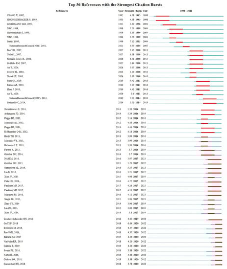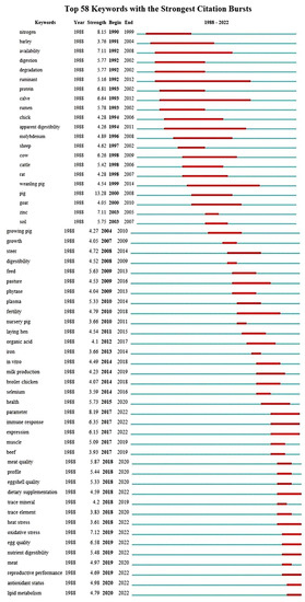 There were fifty-eight keywords that experienced the most significant citation bursts over time period in which these topics were studied. The use of keywords in research papers helps to express the material covered, promote the creation of new knowledge, speed up the retrieval of pertinent data, and draw attention to the relationships between various lines of research in a given field. In order to summarize the important ideas covered in their research, authors frequently include author-generated keywords when submitting an article. Furthermore, Web of Science generates Keyword Plus based on words and phrases found in the titles of referenced sources [98]. The explicit communication of the knowledge structure, the article’s content, and the interconnection of research in a particular topic is facilitated by the use of both author keywords and Keyword Plus. It is interesting to note that the keywords “availability”, “ruminant”, and “calves” had the longest burst times, showing that these subjects have attracted a lot of attention from academics and have gradually increased in importance in the studies [98,99].