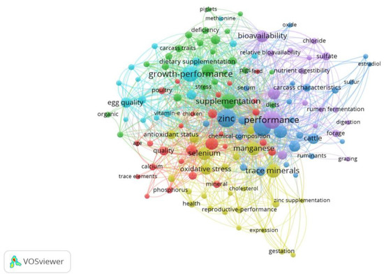 Scientometric analysis is a quantitative and statistical approach for assessing the structure and trends of scientific publications in a given field. In recent years, scientometric analysis has been used to identify current issues, emerging trends, and research gaps in various scientific fields. According to the scientometric assessment of the literature from the standpoint of research structure, many studies have been undertaken in various scientific domains to identify hot and developing issues in order to construct a scientific map [12,13,14,15]. Co-occurrence analysis of keywords has been used for animal models [16,17,18,19,20]. However, research on intellectual structure using two techniques, including co-occurrence analysis of keywords and reference analysis, is scant. As far as we know, there is currently no research addressing the latest developments and emerging trends in the use of CTM in animal nutrition. Despite the growing interest in the use of chelated microminerals in animal nutrition, there is a knowledge gap regarding the current trends and potential applications of CTM.