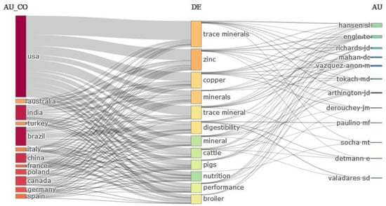 This analysis of chelate research revealed that some countries have conducted more studies on this topic than others. In particular, it was found that the United States of America, Australia, India, and Turkey have performed the most research, as indicated by the height of the respective rectangles in the diagram presented in Figure 10. A closer examination of research conducted in the United States revealed that the majority of studies were centered around trace elements, specifically, zinc, copper, and other minerals. Similarly, most of the studies conducted in Australia were focused on topics such as trace elements, copper, cattle, and swine, and were mainly conducted by the researchers mentioned in references [74,75,76,77]. On the other hand, the studies conducted in India and Turkey also focused on trace elements, zinc, copper, and minerals.