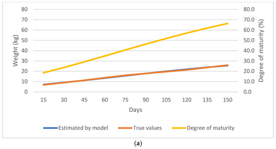 Single-born lambs showed a higher maturity degree compared to twin-born lambs. At weaning, single-born lambs had a 41.2% maturity degree, while this was 31.9% for the twin-born lambs. At 150 days of age, single-born lambs were detected to have a 65.7% maturity degree and twin-born lambs a 60.7% maturity degree. However, it should be noted that the model showed an error of up to 18.77 kg for twin-born lambs, which was observed as the highest error among all the subgroups. Additionally, the model underestimated weight of single-born lambs from 15 to 150 days of age, ranging from 0.6 kg to 3.0 kg (Figure 4a,b).