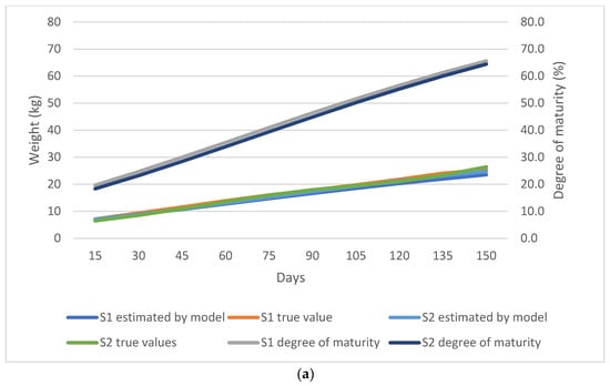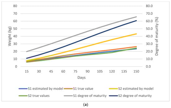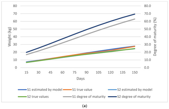 (a) Comparison of the true weight values and the values predicted by the Gompertz model for the season of birth subgroups; S1 denotes spring-born lambs while S2 denotes winter-born lambs. (b) Estimation error of the Gompertz model for the season of birth subgroups; S1 denotes spring-born lambs while S2 denotes winter-born lambs.