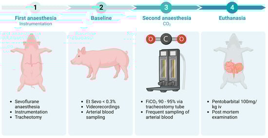 The figure illustrates the experimental timeline for the current study from first anaesthesia to postmortem examination. End tidal sevoflurane is abbreviated Et Sevo, and the fraction of inspiratory carbon dioxide is abbreviated FiCO2. Created with BioRender.com (accessed on 22 April 2023).