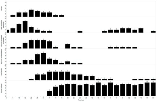 The x axis illustrates time from start of inhalation of 90–95% CO2. The number of pigs exhibiting each behaviour within a five-second period is given on the y-axis. Eleven pigs were studied. The behaviours are described in an ethogram (Table 1). The numbers on the top of the bars refer to the number of pigs exhibiting that specific behaviour within a given 5-s interval.