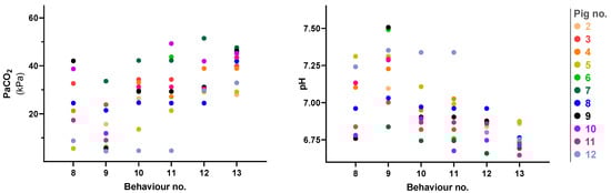 Figure illustrates PaCO2 (left) and pH (right) at the onset of key behaviours exhibited by pigs inhaling 90–95% CO2. Behaviours are numbered on the x-axis as follows: 8 = gasping, 9 = slow extremity movement, 10 = vigorous extremity movement, 11 = vigorous head movement, 12 = opisthotonos, 13 = agonal gasping. Each dot represents an individual pig, and each pig was assigned an individual colour, as shown on the right. The individual colours are consistently used for the pigs through all figures. Pig no. 2 accidentally received a fraction of inspired oxygen of 0.10. Additionally, the tracheostomy tube of pig no. 3 disconnected from the breathing system at 30 s and was reconnected at 40 s.