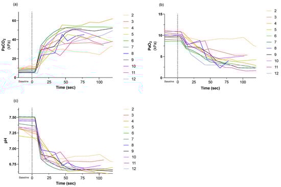 Cardiovascular variables, i.e., mean arterial blood pressure and heart rate have been studied during CO2 stunning in pigs [15,20,21]. Ventilatory variables beyond a visual assessment of respiratory pattern and frequency have not been studied. Arterial pH, gas tensions, and mean arterial blood pressure are affected by CO2 inhalation, and major derangements may render the brain incapable of maintaining consciousness. Previous studies have statistically analysed these variables in terms of population indices of central tendency, i.e., means and or median values. However, we believe that from a welfare position, a case may be made for individual pigs to be studied.