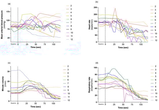 Cardiovascular and respiratory variables during baseline and CO2 inhalation. (a) Mean arterial blood pressure (mmHg), (b) heart rate (beats/min), (c) respiratory minute volume (litres) and (d) respiratory rate (breaths/min) are given on the y-axis and time (seconds) is given on the x axis. Administration of 90–95% CO2 started at time 0. Each line and number represent an individual pig, and each pig was assigned an individual colour, as shown on the right. The individual colours are consistently used through all figures. Pig 2 inspired a fraction of oxygen (FiO2: 0.10), and pig 3 accidentally became transiently disconnected from the breathing system.